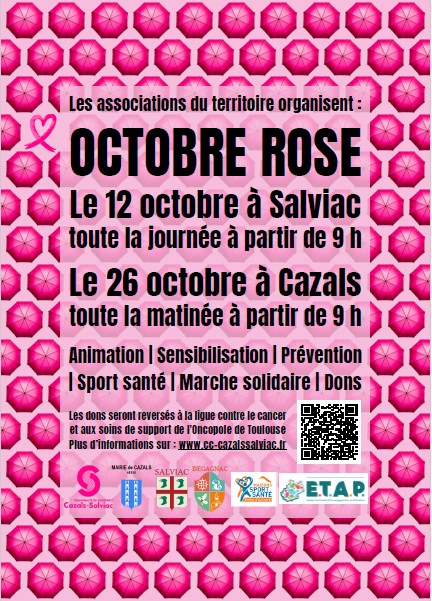 Cet événement est mené par 2 associations support : Ça marche (Dégagnac-Salviac) et Cazalsrando (Cazals) en partenariat avec la Communauté de communes Cazals-Salviac, les communes de Cazals, Dégagnac et Salviac, l’Equipe Territoriale d’Accompagnement en Prévention (ETAP) du Centre Hospitalier de Gourdon et la Maison sport et santé de Gourdon. Une collecte de dons sera organisée par les associations support au cours des deux journées. Les fonds recueillis seront reversés à la Ligue contre le cancer et aux soins de support de l’Oncopole de Toulouse. Si vous n’êtes pas disponibles le 12 ou le 26 octobre, vous pourrez déposer vos dons et/ou acheter des rubans/parapluies roses directement dans vos commerces de proximité.
